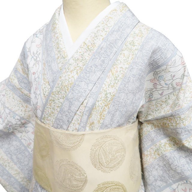 > 紬地 着物 中古 リサイクル 正絹 袷 カジュアル 植物文様 松 梅 灰白色 灰色 多色 身丈159.5cm 裄65cm M きもの北條 A1278-1