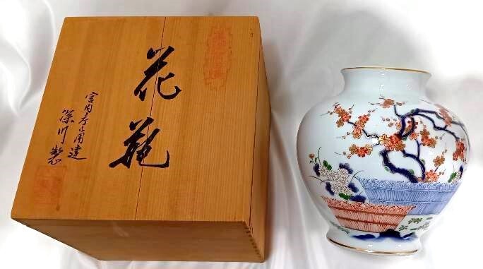 - S■深川製磁 色絵彩磁 有田焼 花瓶 陶器 木箱付き■