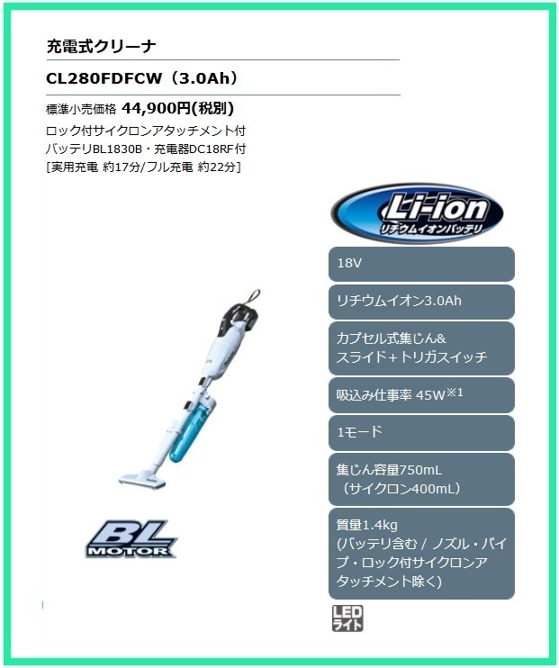 > マキタ 18V充電式クリーナ CL280FDFCW白 (本体+3.0Ahバッテリ+充電器)「カプセル式集じん」【サイクロンアタッチメント付】■純正/新品■