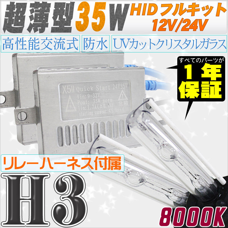 - 高性能 薄型HIDキット 35W H3 リレー付 8000K 12V/24V 【交流式バラスト&クリスタルガラスバーナー】