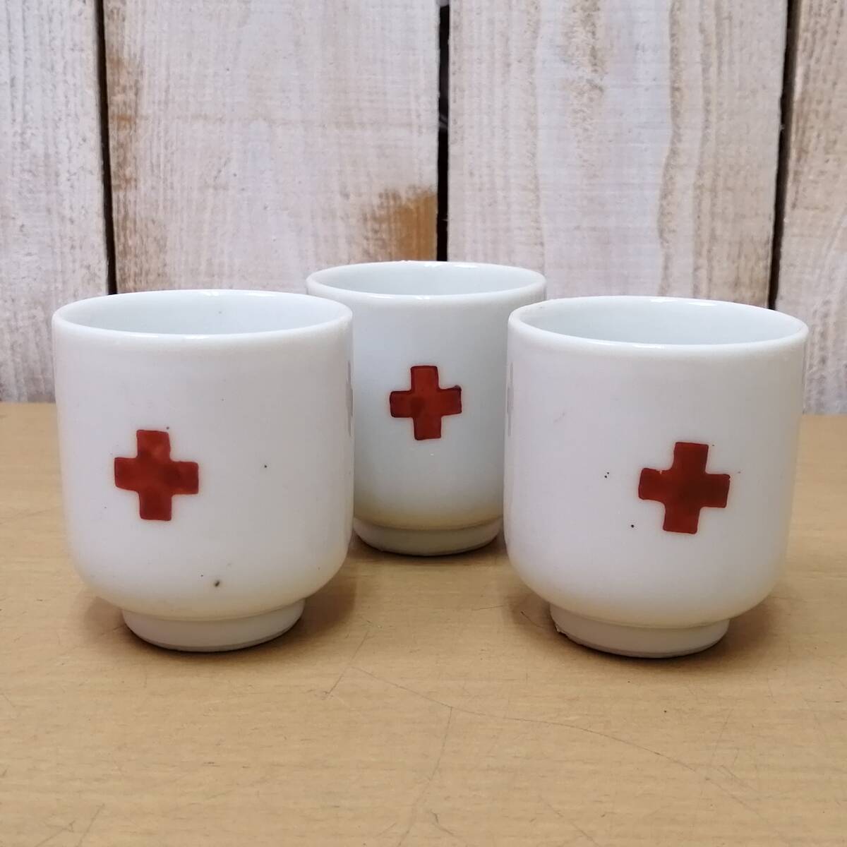- 〇25100202 赤十字 当時物 陶器 3点セット 湯呑 ぐい呑み 病院食器 計量 30ライン入り 軍物 戦場 医療 救護 衛生