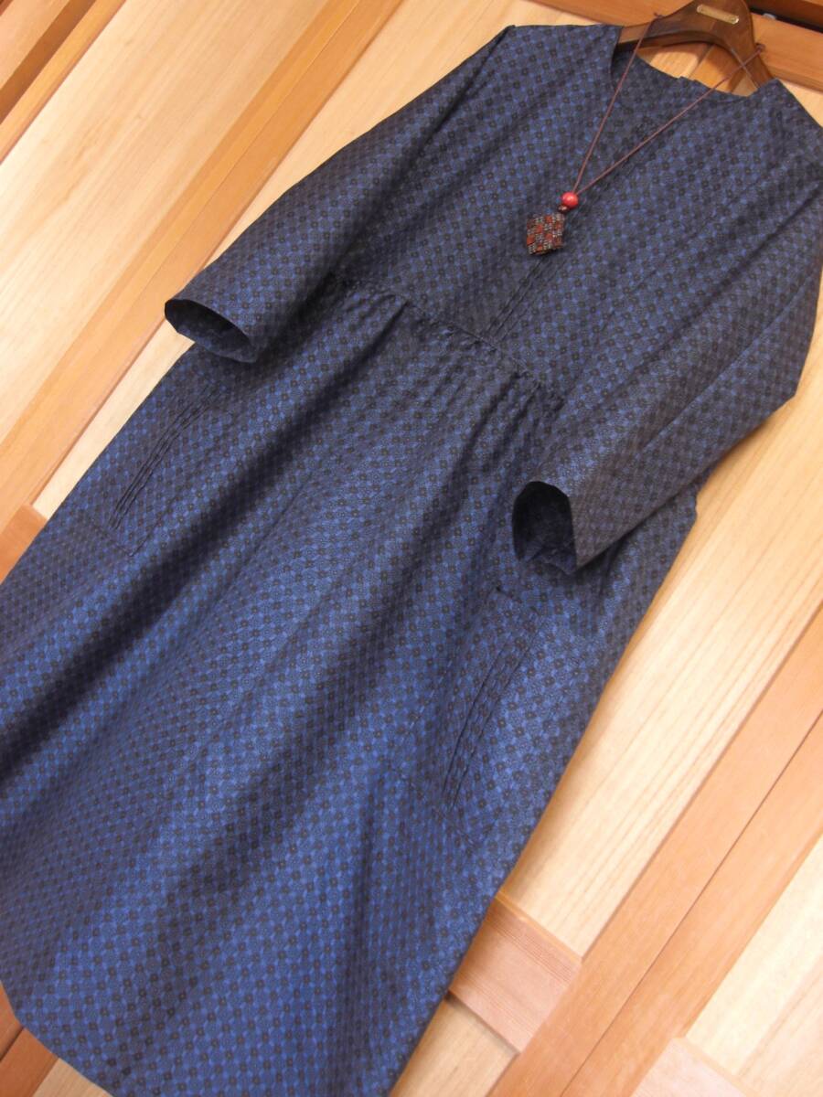 - Biwa着物リメイク 藍大島紬 ワンピース 泥大島 ゆったり 正絹 ピンタック ウエスト切り替え 共布ブローチ付 手作り ハンドメイド