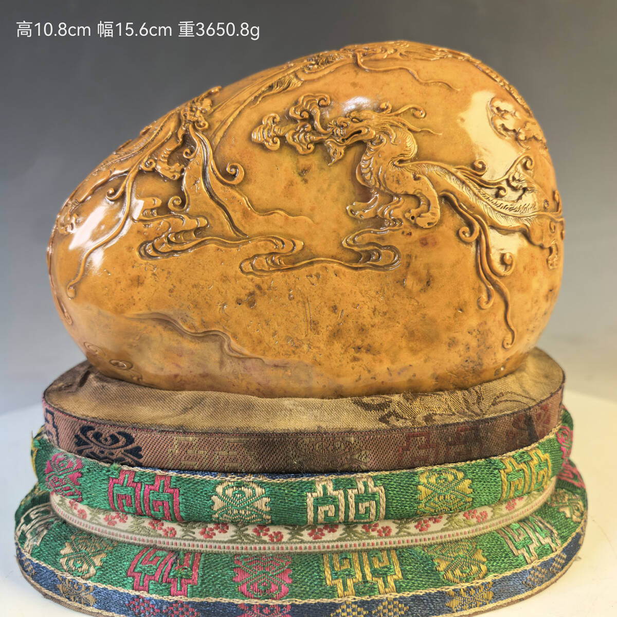 - 古石彫 寿山石 中国・清時代 内務府造 【田黄石彫刻雲竜紋山子置物】 文房置物 台座付 古賞物 唐物 時代物 重3650.8g LT-251005