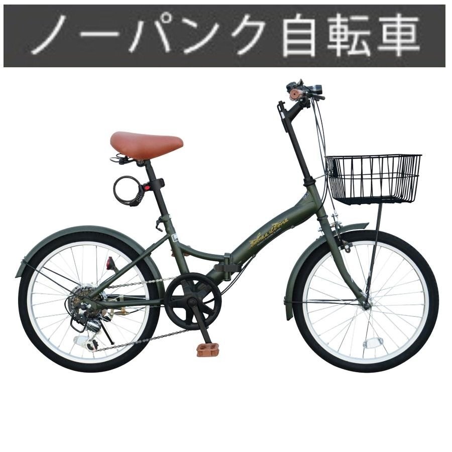- [空気入れ不要!!]ノーパンク20インチ折りたたみ自転車 シマノ6段変速 カーキ【本州・四国 送料無料!】 カゴ付き