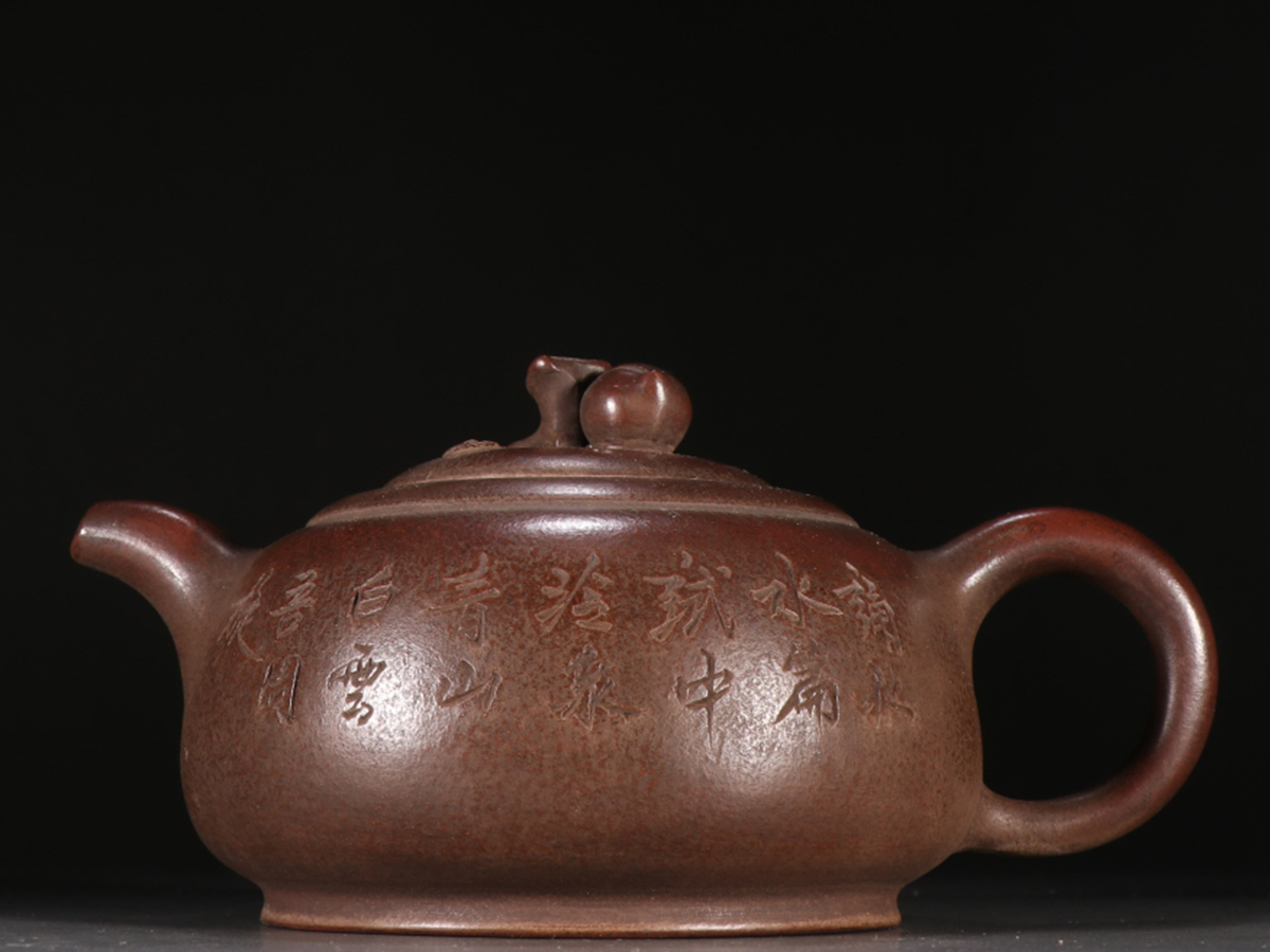 > ▽鴻▽清時代 在銘 寿桃鈕漢詩紋茶壺 宜興紫砂 常滑 朱泥急須 煎茶道具 茶壷 時代物 中国古美術 骨董品