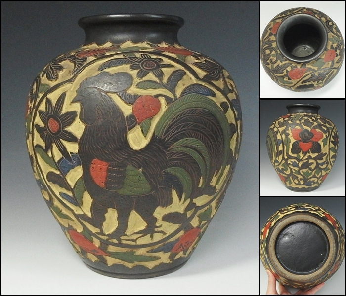 - 【251003-8】琉球古典焼黒田焼掻落鶏草花紋壺 エキゾチック 壺屋焼沖縄陶磁器