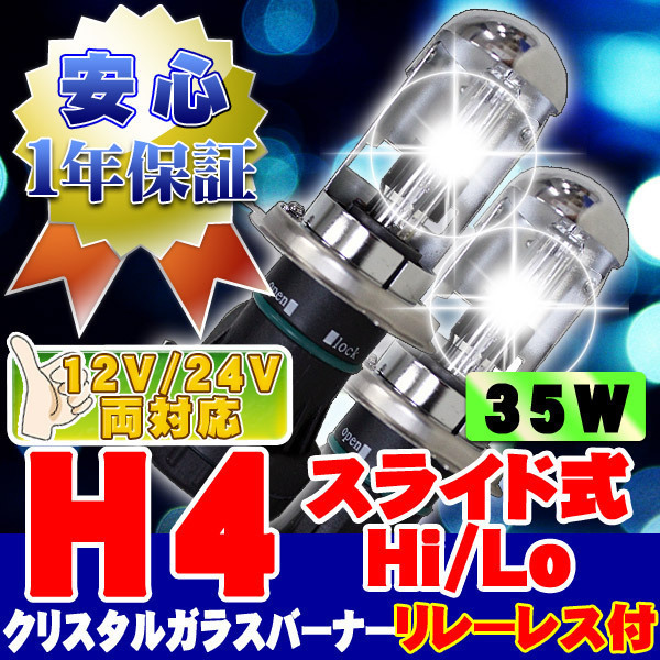 > HIDバーナー 35W H4 Hi/Loスライド式 8000K リレーレス付 12V/24V 交換用左右セット UVカット加工 石英ガラス ヘッドライト