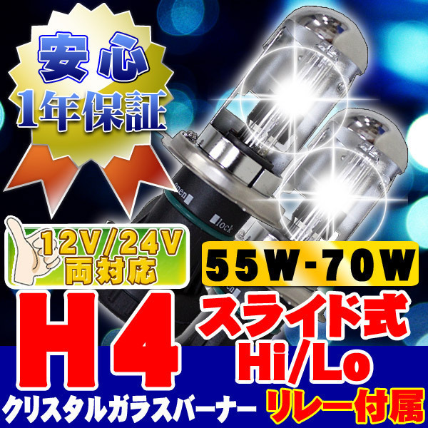 > HIDバーナー 55W-70W H4 Hi/Loスライド式 8000K リレー、ワーニングキャンセラー付 12V/24V 左右セット UVカット加工 ヘッドライト