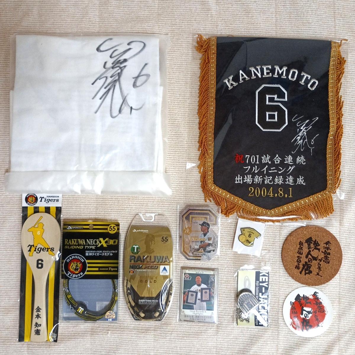 > 直筆サイン入り 金本知憲 限定Tシャツ 阪神タイガース ラクワネック キーホルダー ピンバッジ 記念日 BBMカード シールなど11点セット