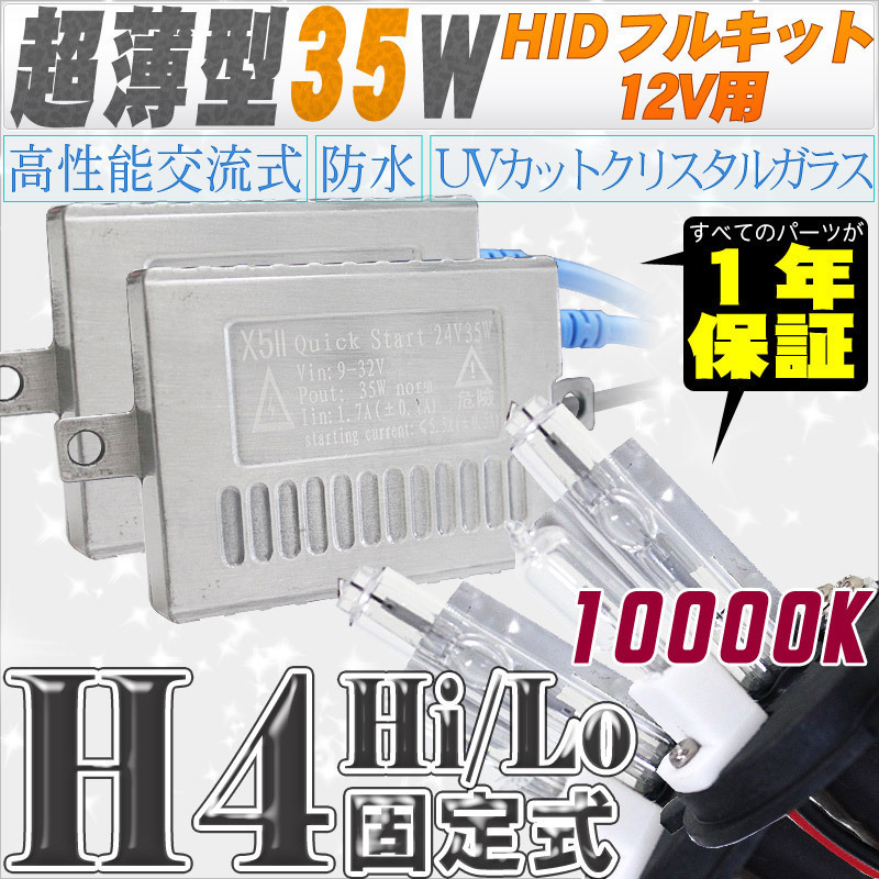 - 高性能 薄型HIDキット 35W H4 Hi/Lo 固定式 10000K 12V 【交流式バラスト&クリスタルガラスバーナー】