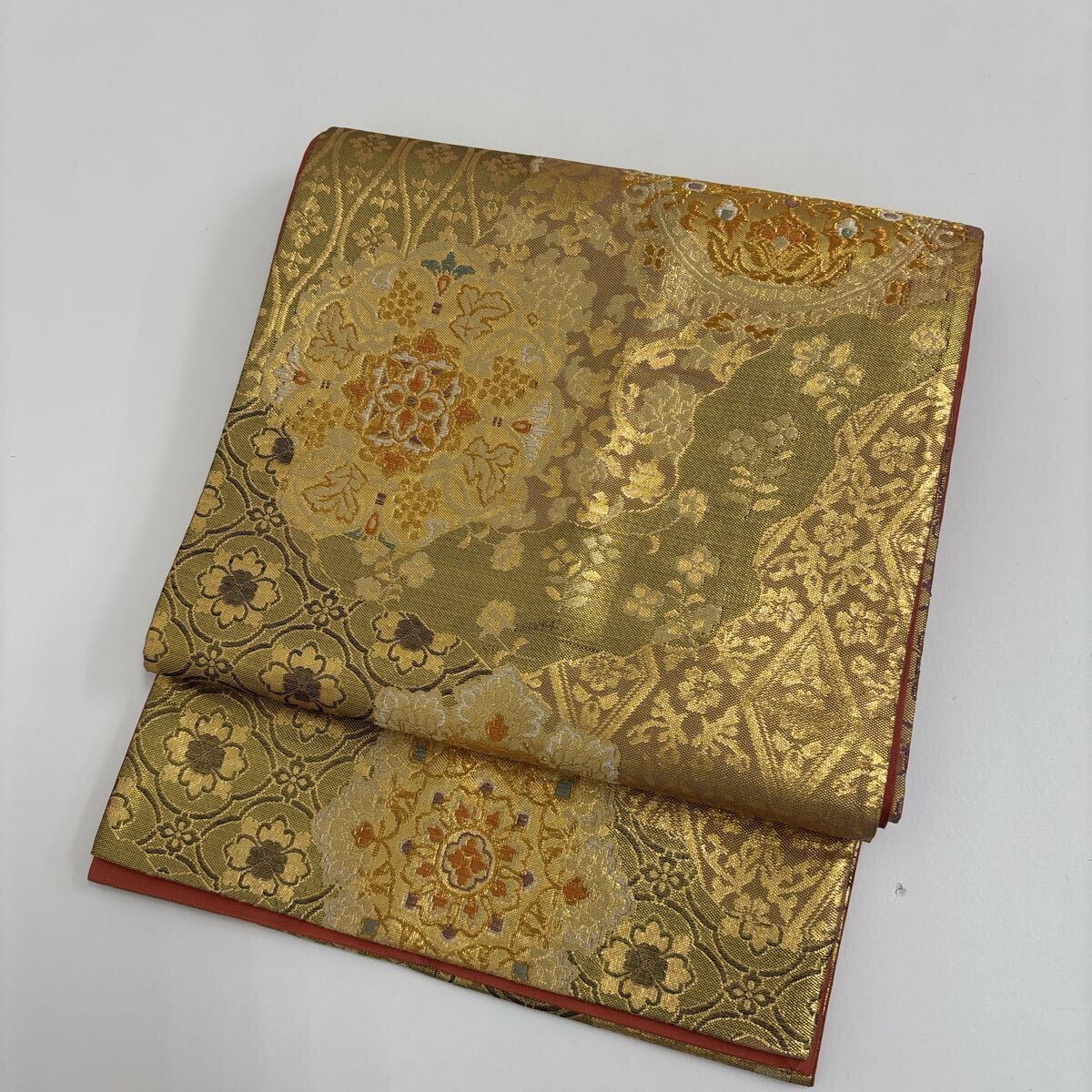 - 袋帯 金彩 正倉院文様 丸に狩人 正絹 W-4588