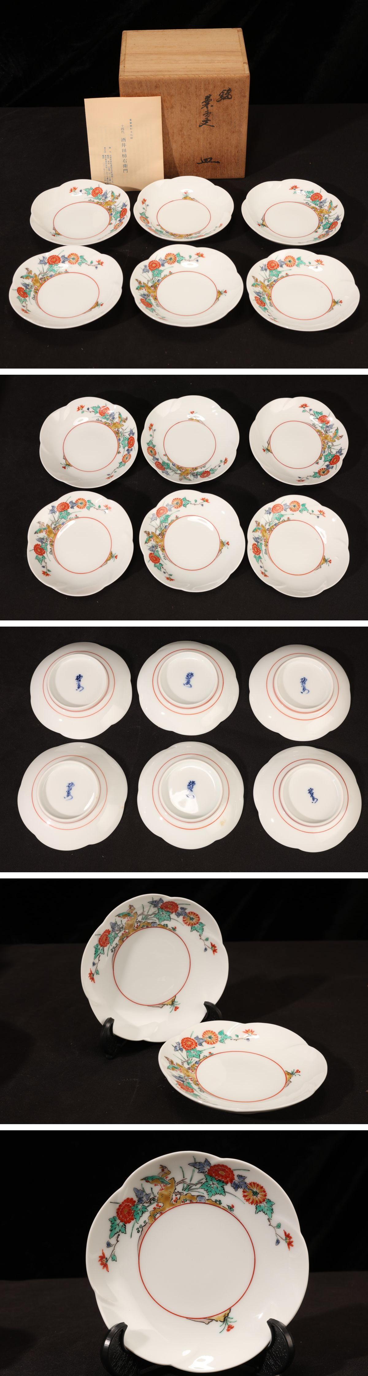 > 珍品堂 1円から T83-15 人間国宝 無形文化財 十四代 酒井田 柿右衛門 染錦 菊梅花紋 皿 6枚 共箱 木箱 時代物 古美術 骨董品 アンティーク