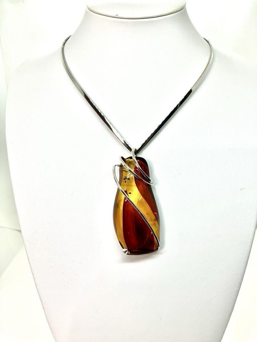 - 【新品】リトアニア産バルティックアンバーV型オメガネックレス/天然琥珀デザイナー作品/一点物/大ぶり/希少/マルチカラー琥珀ネックレス付