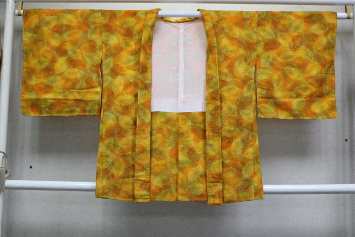 - きもの今昔9031 羽織コレクション 正絹一越地橙色とベージュ色ボカシに落ち葉模様 しつけ付き未使用 羽織り丈78cm