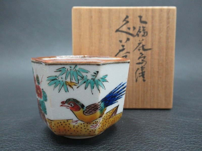 D2877 浅蔵五十吉 九谷焼 色絵 花鳥絵 ぐい呑 七角 猪口 酒盃 酒杯 酒器