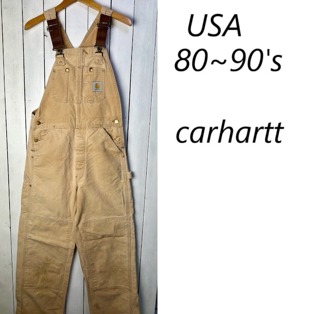- USA古着 80s~90s carhartt ダック生地ダブルニーオーバーオール S~M フェード薄茶 カーハート オールド ヴィンテージ USA製 厚手 ●104