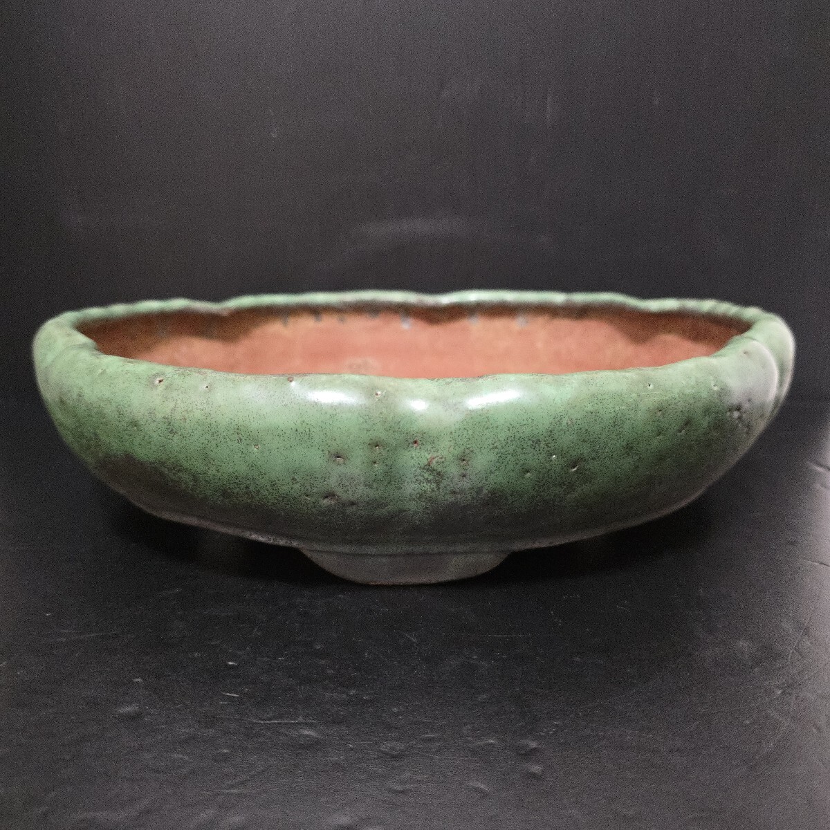 - 物が良い【 秀峰 手作り 釉薬最高峰 緑釉窯変袋式輪花式 】33センチ/展示会/中品盆栽/花物盆栽/雑木盆栽/コレクション