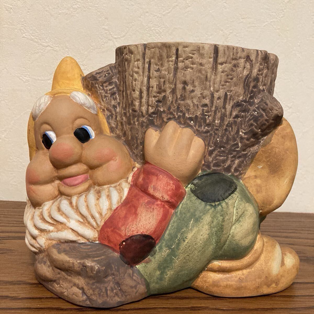 - 陶器 小人の鉢カバー プランター ガーデン雑貨 木の切り株 レトロ 置物 オブジェ インテリア 小物入れ