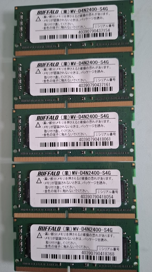 - 中古実働機外しノートPC用4GBメモリ 5枚セット計20GB バッファローMV-D4N2400-S4G 5枚