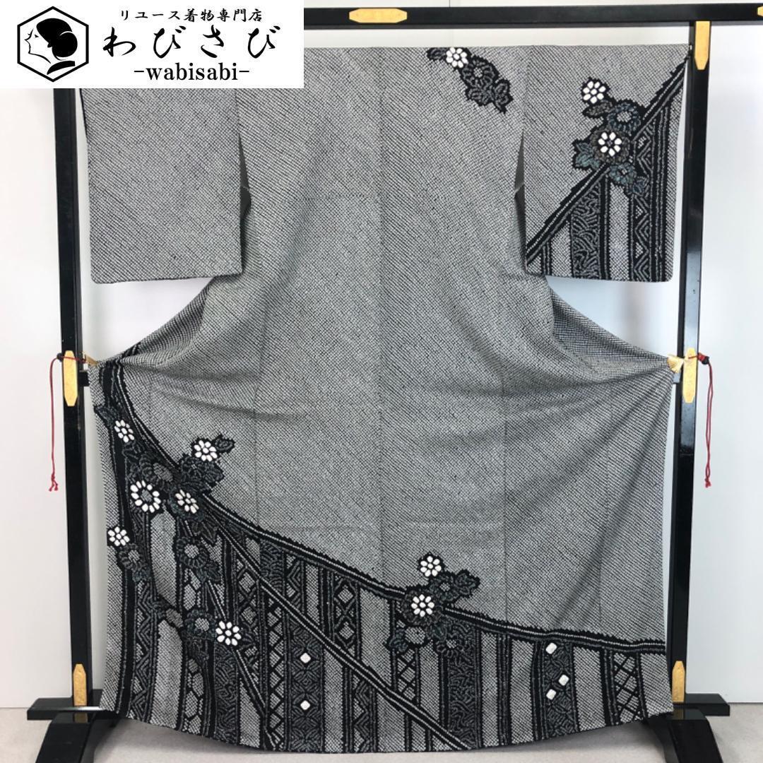 > 訪問着 総絞り 花柄模様 黒色 ガード加工 トールサイズ K-5318 着物 きもの kimono 和服 和装 中古 リサイクル着物 【送料無料】