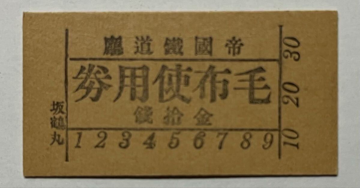 - 複製 硬券 A型 帝國鐵道廰 毛布使用券 金拾錢 坂鶴丸