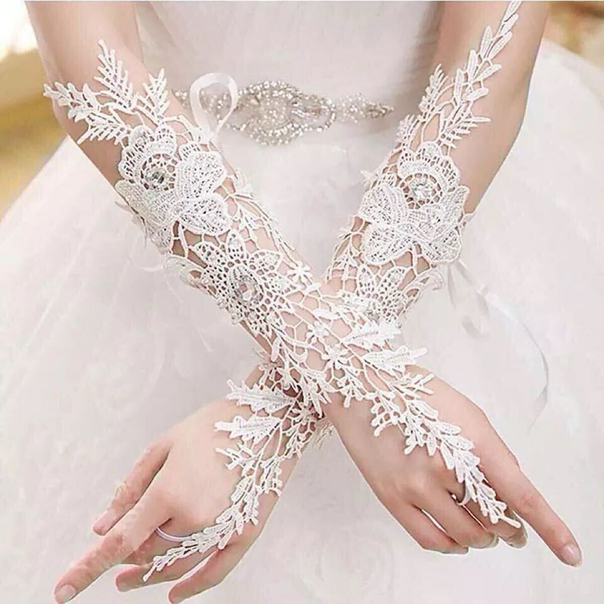 - ブライダルグローブ フィンガーレス ホワイト 結婚式 披露宴 パーティー 手袋 グローブ ウエディング ウェディング レース ストーン