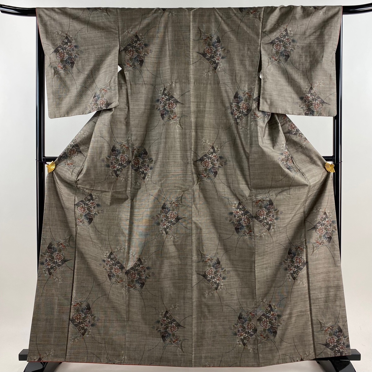 - 【美品】 紬 身丈164cm 裄丈67cm M 袷 草花 灰茶 正絹 秀品 【中古】