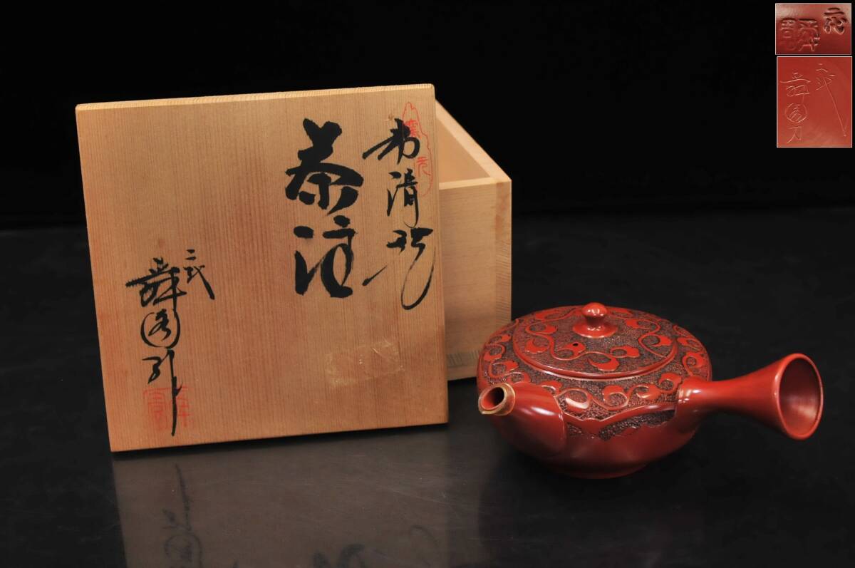 - 【真作】 二代 間野舜園 『常滑焼 茶注』 唐草文 朱泥横手急須 高さ:約7cm 重量:172g 共布共箱 茶器 03408054-1