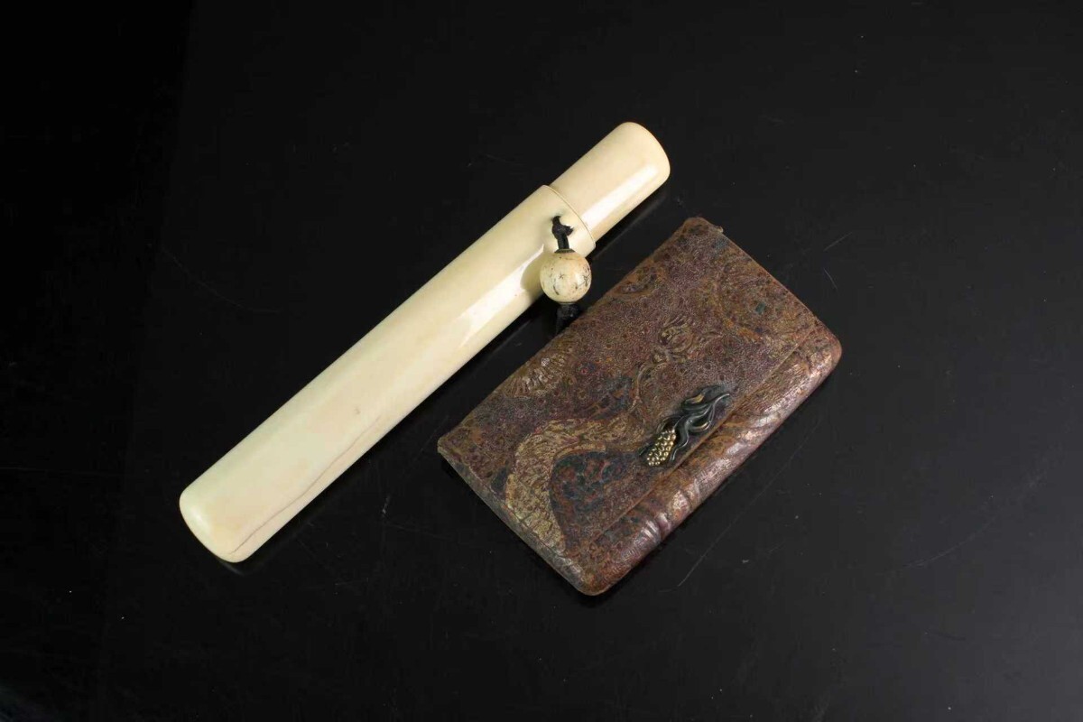 - K1987 時代 提げ物 煙管筒 煙草入 喫煙道具 天然素材 東洋雕刻 【{