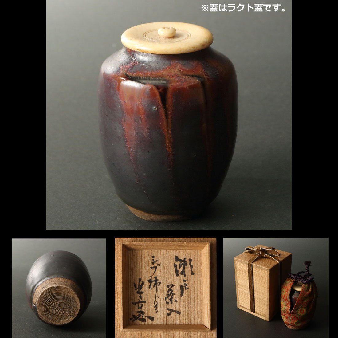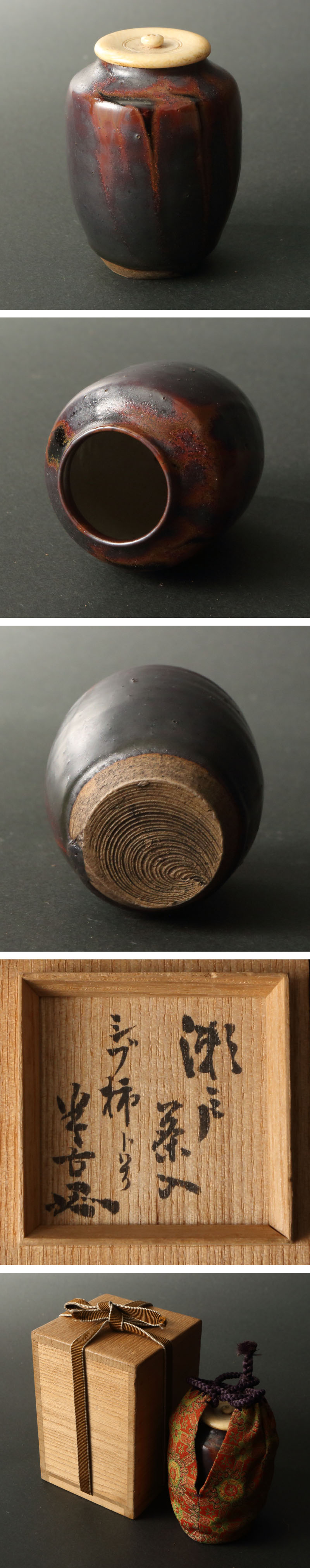 > 【深和】時代◆瀬戸撫肩茶入 松尾半古斎書付 銘「シブ柿」(茶道具 瀬戸焼 鉄釉 柿釉茶入 瀬戸茶入 松尾流 茶人 宗匠)