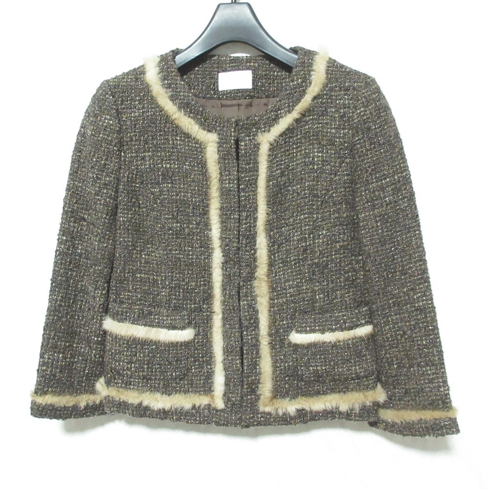 > 美品 Harrods ハロッズ ミンクファートリム ツイードノーカラージャケット saizu 2 ブラウン