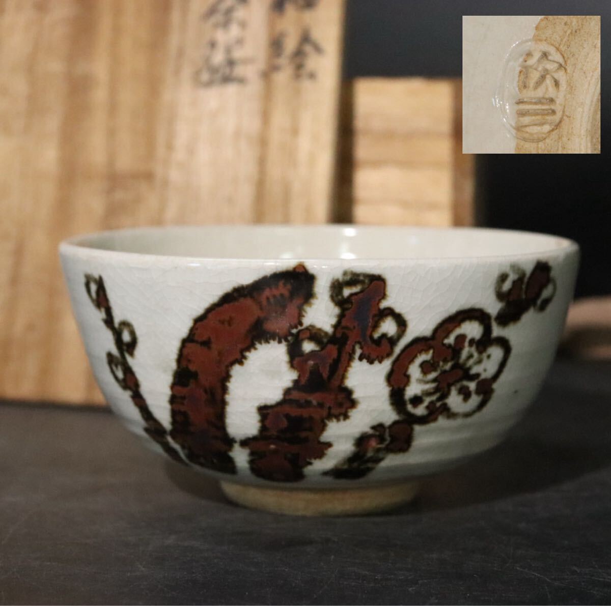 - 岡本欣三 作 鉄絵 「 梅絵 茶碗 」 共箱付 / 茶道具 煎茶道具 .B1194