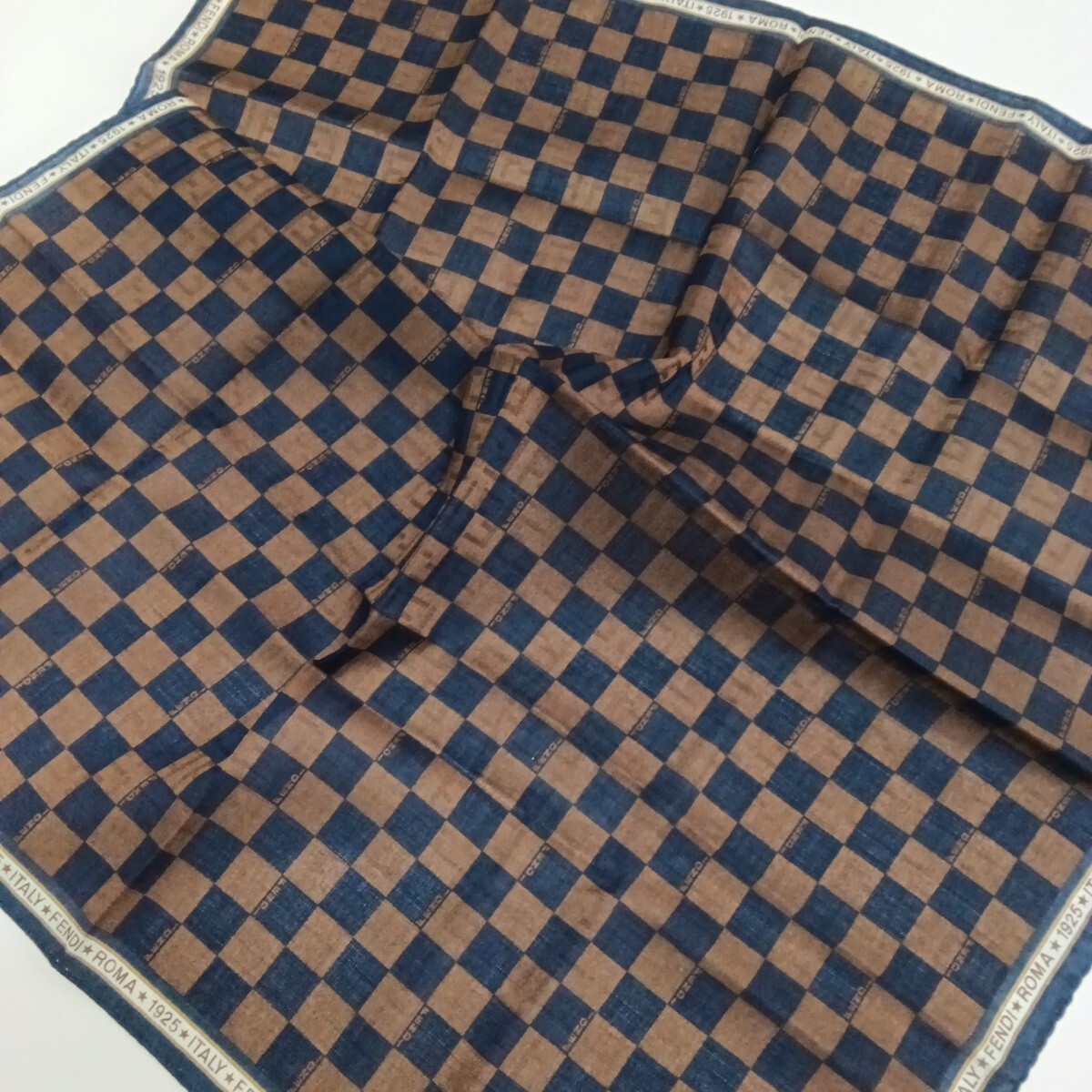 - FENDIフェンディハンカチ【 ダイス柄 50cmミニスカーフ 】ブラウン×ネイビー