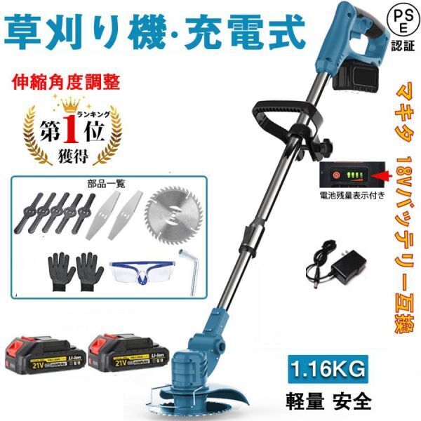 - 充電式 草刈機 21V刈払機 コードレス 伸縮 角度調整 雑草 21Vバッテリー1個付き 枝切り マキタ18Vバッテリー対応 3種類の替え刃 翌日発送