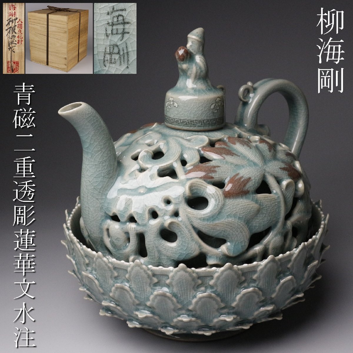 > 【LIG】韓国人間国宝 柳海剛(柳根瀅) 青磁 二重透彫蓮華文水注 辰砂 共箱 希少作品 [.UU]25.9