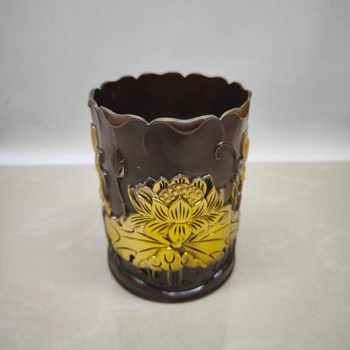 - 『館蔵珍品 紫銅製 塗金 小荷花 筆筒 置物 賞物』稀少珍蔵品 古賞物 貴重物品 収蔵品 中国古美術 時代物 古董品
