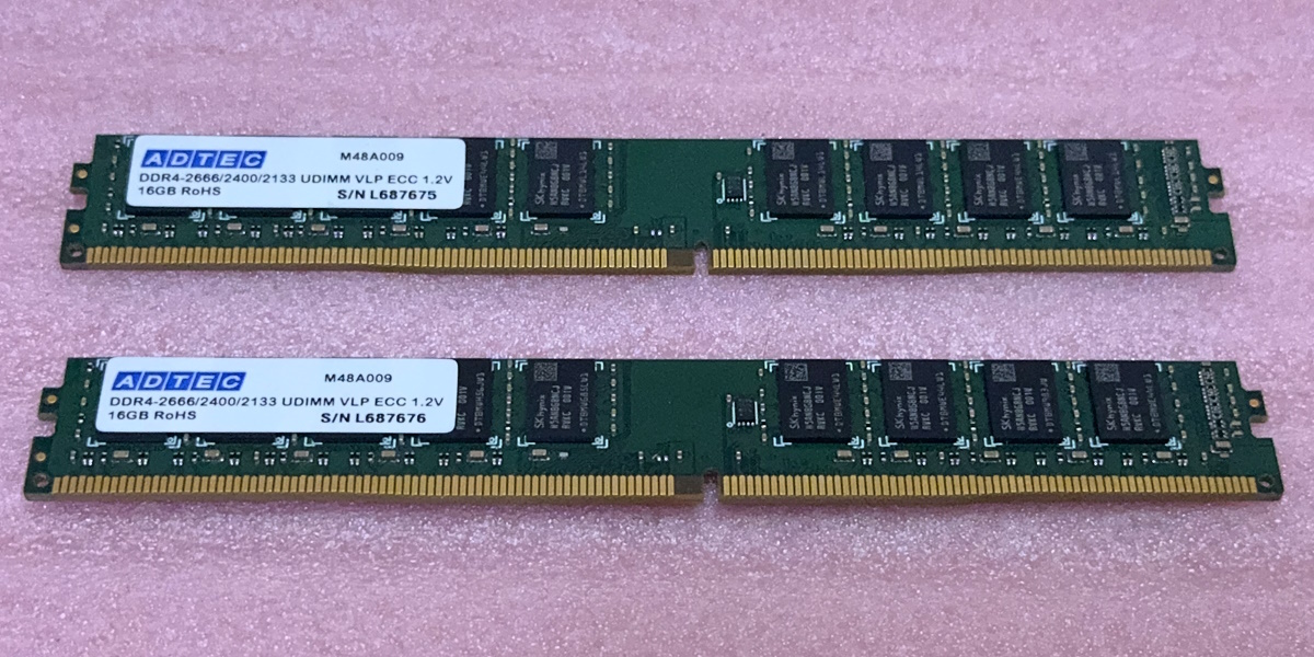 - ○ADTEC M48A009 2枚セット - PC4-21300/DDR4-2666 SK hynixチップ ECC Unbuffered 288Pin VLP DDR4 UDIMM 32GB(16GB x2) 動作品