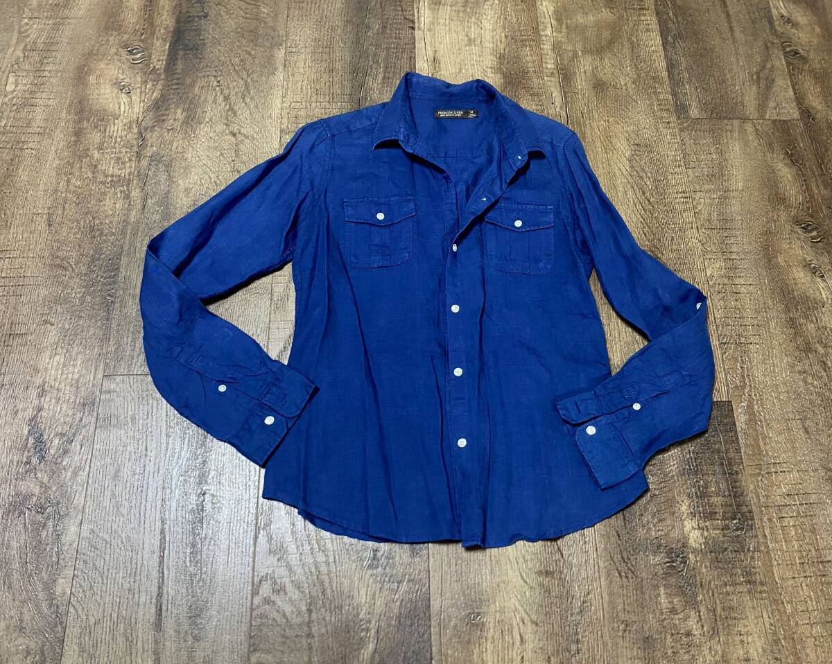 - 福祉バザー ユニクロ★プレミアムリネン麻100%シャツ青M