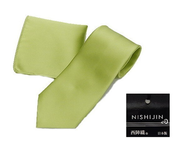 - 西陣織 ネクタイ チーフ付 黄緑 無地 朱子織 シルク100% 日本製 ソリッドタイ メール便可