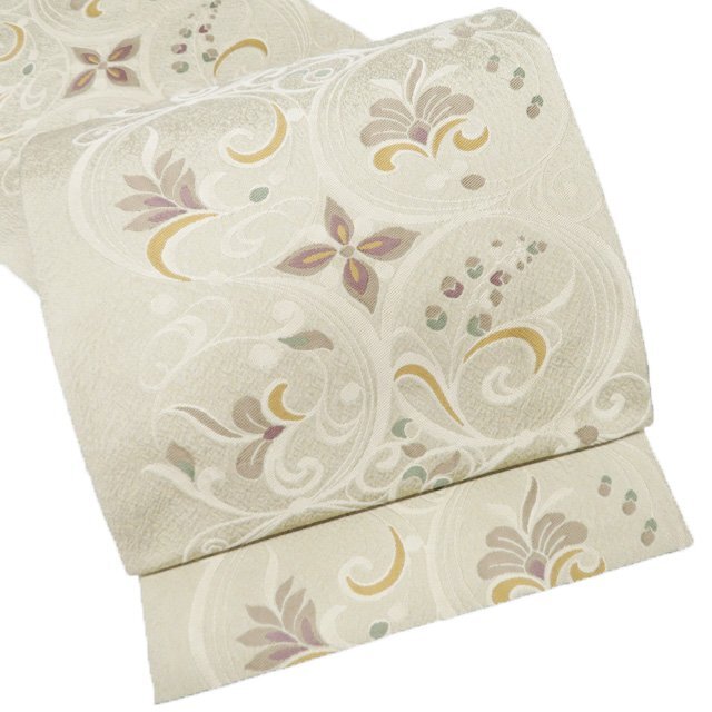 - 袋帯 中古 リサイクル 正絹 カジュアル 仕立て上がり 植物文様 六通 淡い抹茶色 多色 きもの北條 A1284-15