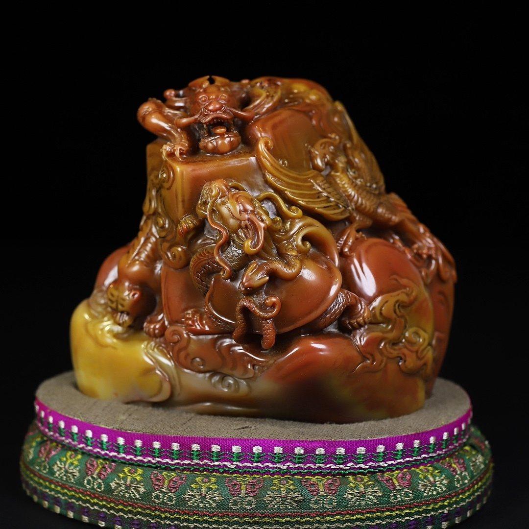 - 旧蔵 【清代篆刻家 鄧石如 號:古浣子】寿山芙蓉石 彫刻【青龍 白虎 朱雀 玄武】四大神獣鈕 印鑑 天然石 篆刻 極細工 中国古玩 骨董品 210