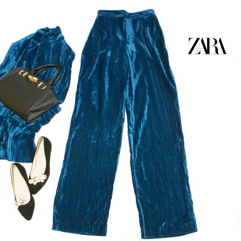 - 美品 ZARA ザラ お洒落 艶 シワ ベロアパンツ ストレート ワイド パンツ XS ブルー 青 個性派 上品