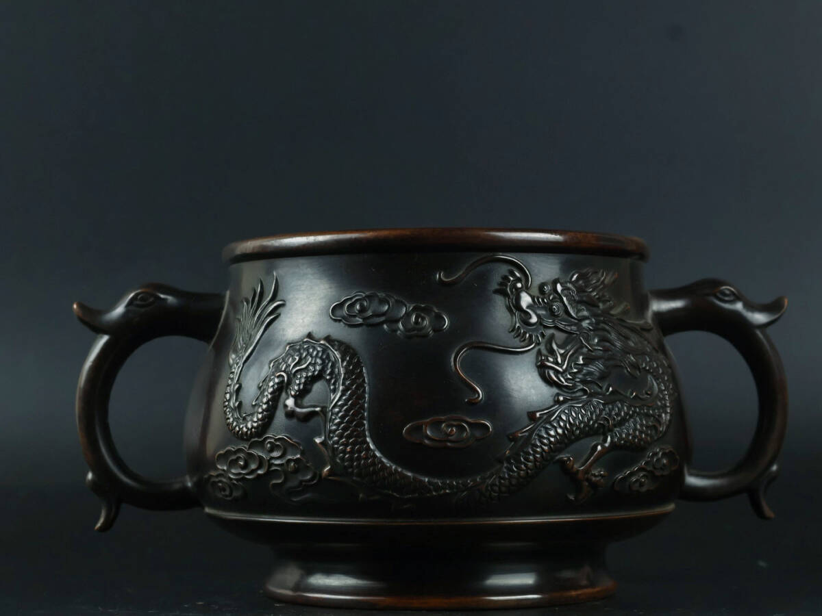 - 『館蔵珍品 紫銅製 浮彫 雲龍紋 雙耳爐 置物 賞物』稀少珍蔵品 古賞物 貴重物品 収蔵品 中国古美術 時代物 古董品
