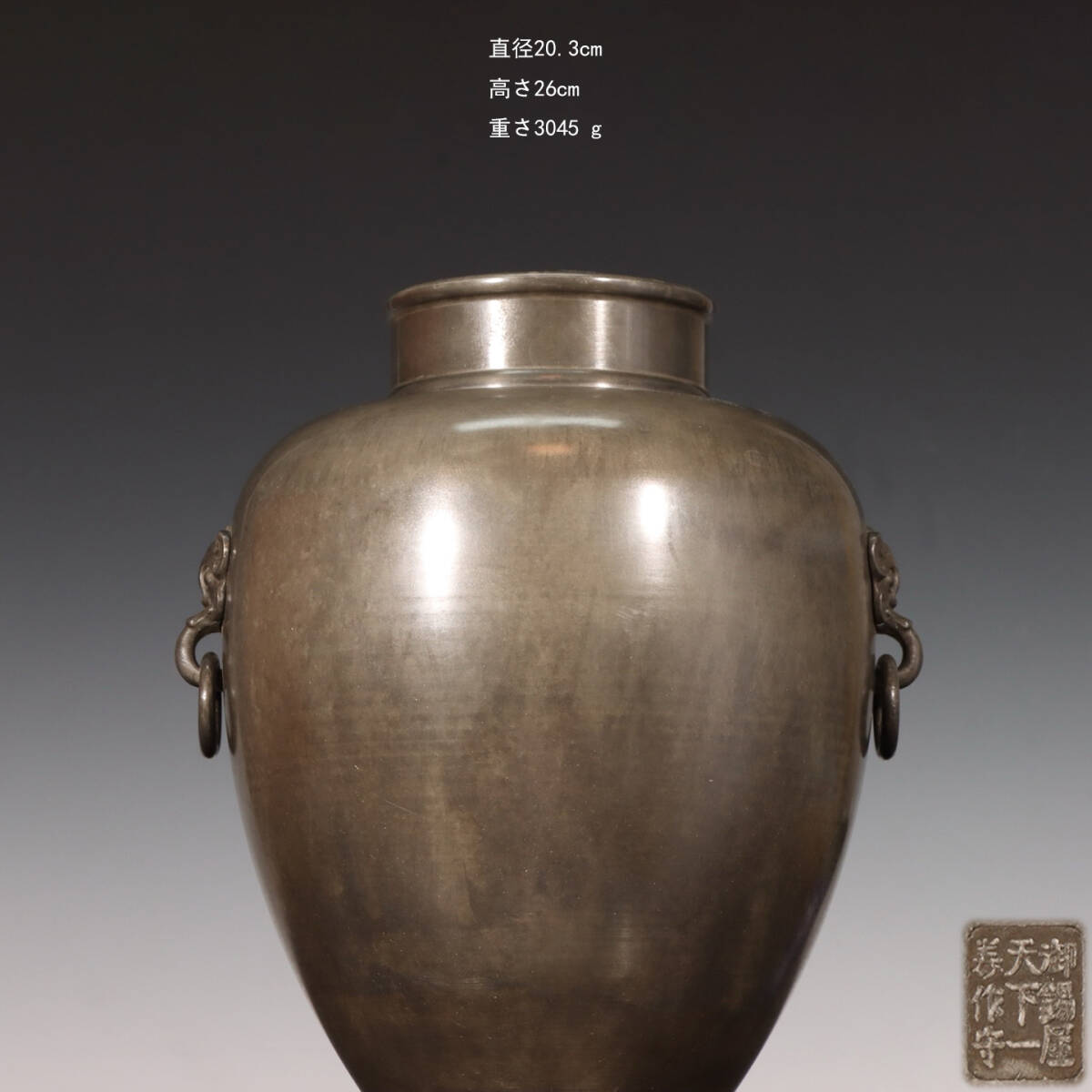 > 古錫 茶葉罐 御錫屋天下一美作守 「錫製輔首両耳大茶心壺」 茶筒 茶入 茶壷 茶道具 錫肌 金工 茶器 時代物 重さ3045g LT-251018