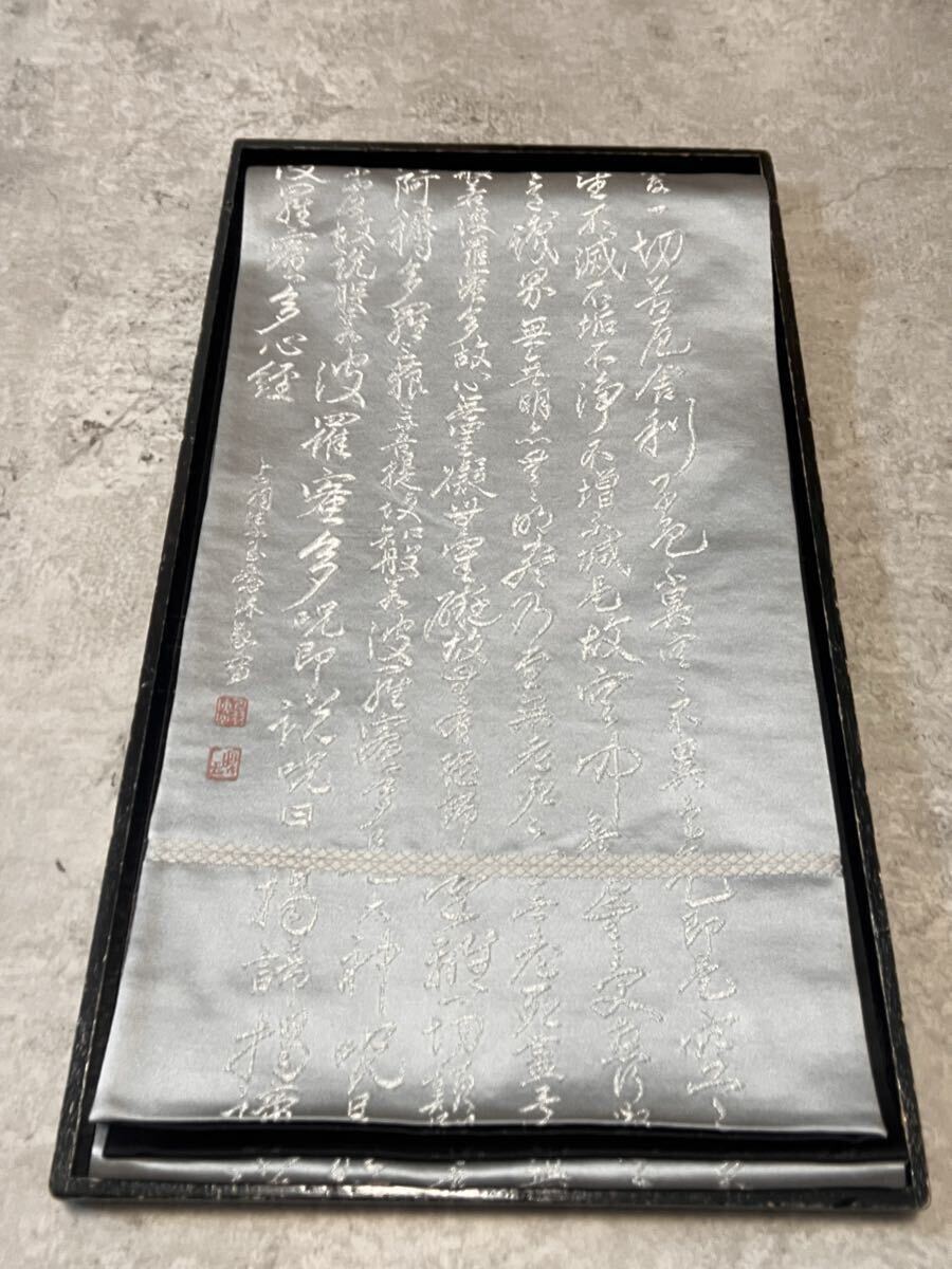 > 帯 般若心経 両面 正絹 袋帯 黒グレー 字 銀糸 織物
