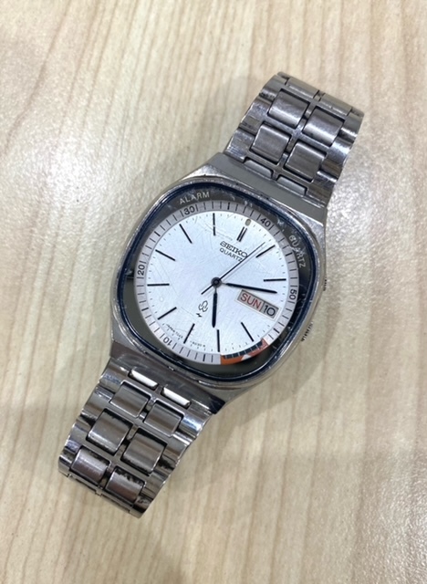 > F7-9-67 電池交換済 稼働品 SEIKO セイコー 7223-603A ALARM アラーム 音確認済 QZ クォーツ 腕時計 デイデイト 風防傷あり ベルト社外品