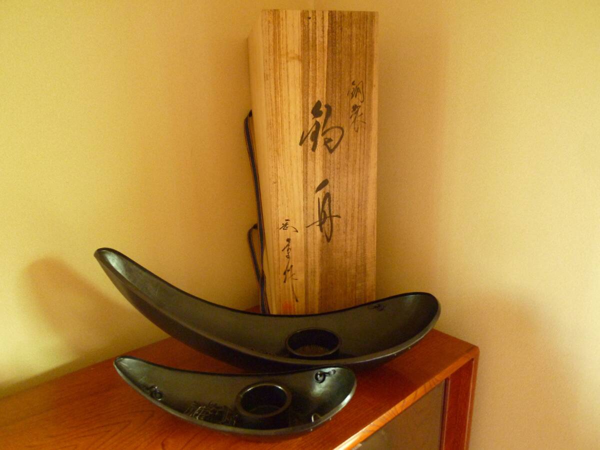 - 【特大・作家物】銅製舟形吊花入 2個セット(幅52.5cm.幅31.5 cm) 木箱入り 花器 吊り花生 茶道具 華道具