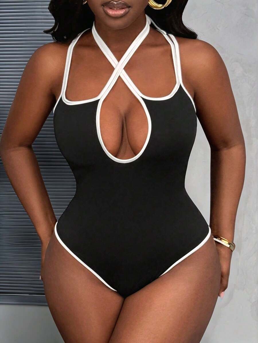 - ボディスーツ 女性用クリスクロス ホローアウト セクシーホルターボディースーツ