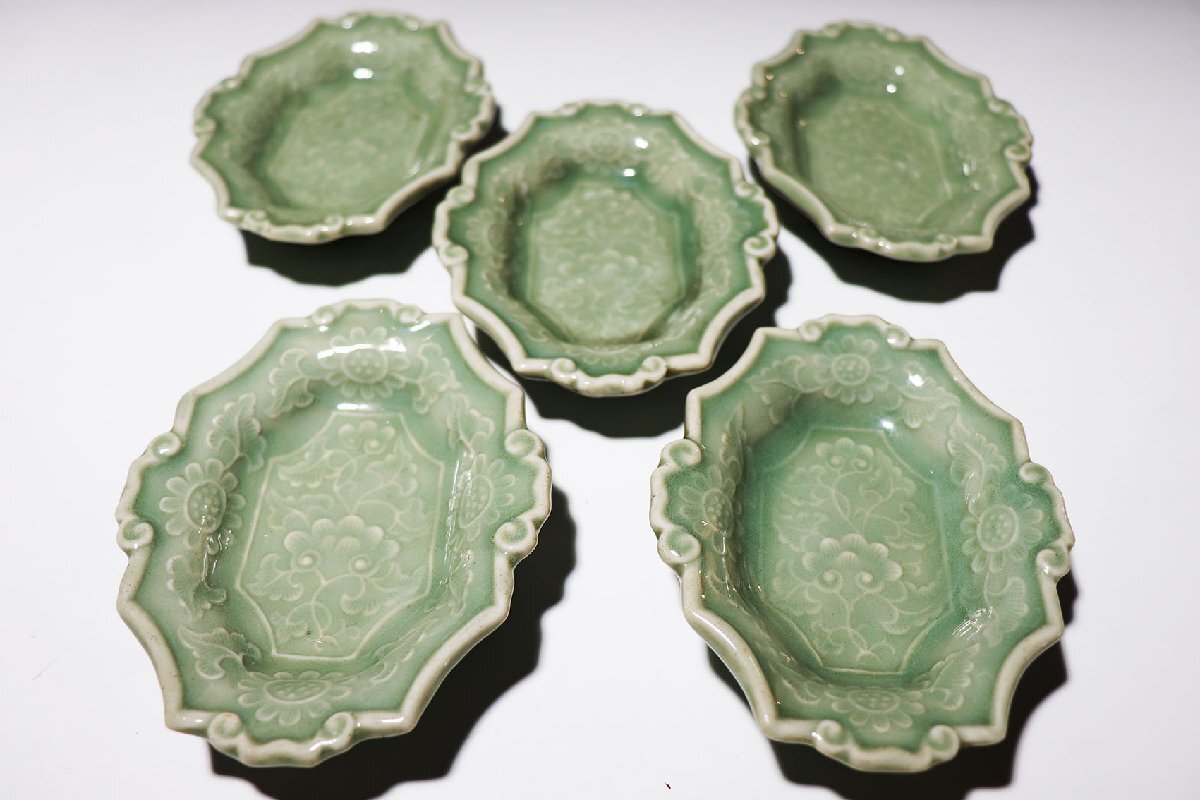 - 【桃】三田青磁陽刻花唐草紋様図変形皿 五客