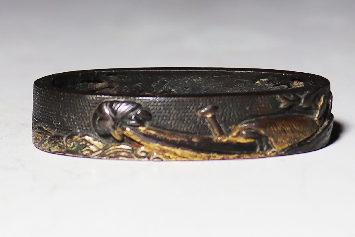 - 【桃】刀装具:金工銅地鍍金舟に鵜の図縁
